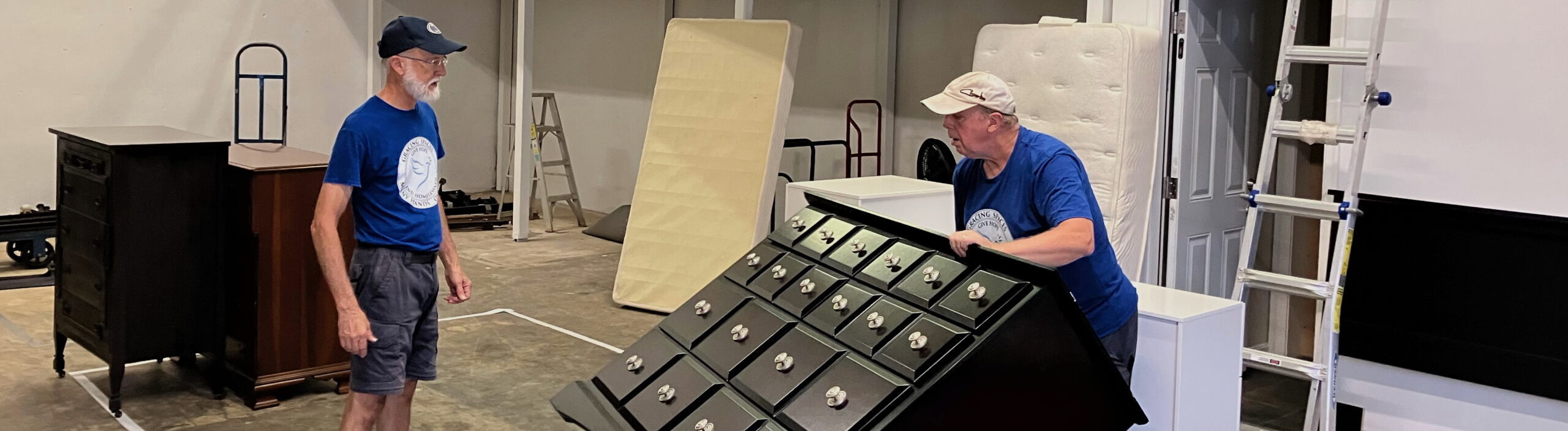 On August 27, we began operating in our new warehouse space!  Added to our original warehouse just across the parking lot, itโ€™s making things so much easier for both volunteers and clients.  Storage and deliveries that had been spread over several smaller spaces are now being accommodated between these two warehouses.